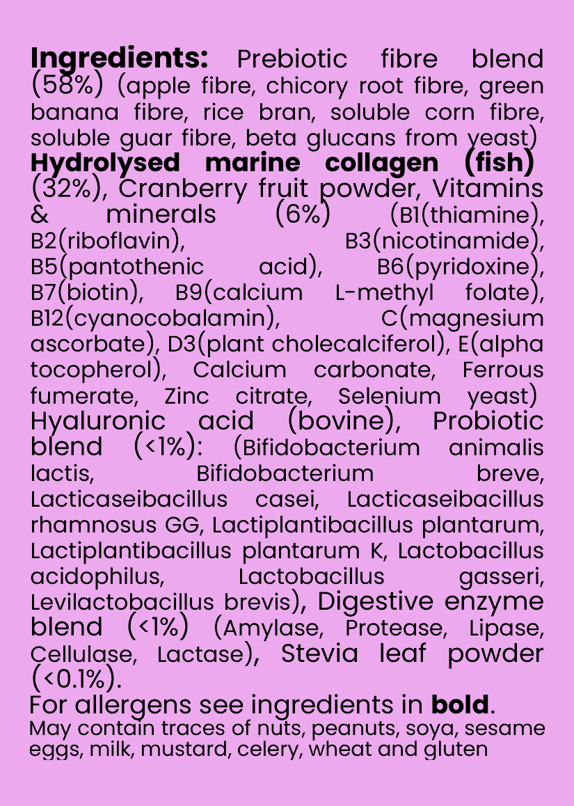 Gutblends Skin is a synbiotic designed to support your gut and skin. It contains a diverse selection of 7 types of prebiotic fibre, 9 science-backed probiotic strains, digestive enzymes, collagen, hyaluronic acid, gut focused vitamins and minerals, and polyphenol rich freeze dried cranberry.
