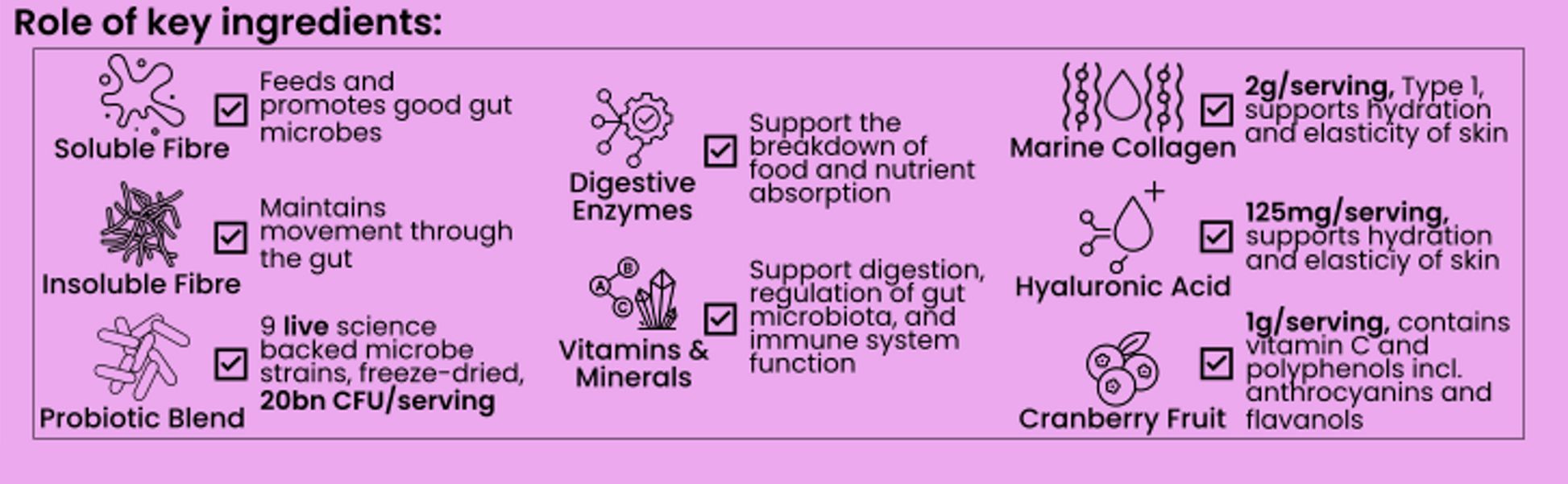 Product serving contains >2.5g of diverse prebiotic fibres from over 7 sources, 5 or 9 strains of scientifically researched probiotics well known to survive to the gut (at 20 bn CFU/g per serving), and 5 digestive enzymes.
